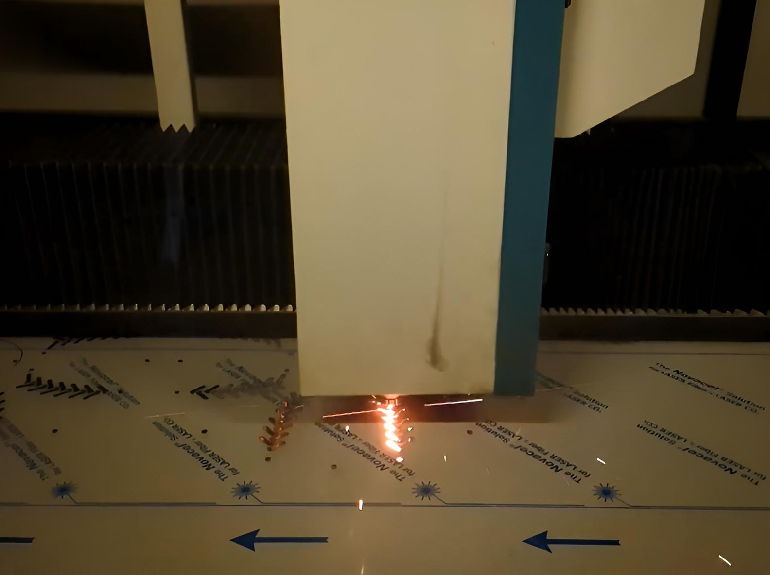 A close-up view of our CNC fiber laser cutting machine in action, producing clean, burr-free cuts in sheet steel with minimal heat distortion.